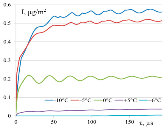 The gas temperature in the bubble rises almost in proportion to the pressure increase. A comparison of Figure 9 and Figure 10 indicates that the basic hydrate formation process occurs in the first 20 μs and the achieved hydrate formation values can be maintained if the pressure under the hydrate formation crust conditions is reached at the boundary of phase interface. Therefore, a temperature decrease promotes hydrate formation, but only at the beginning of the process—as a solid hydrate crust is formed at the interface, which prevents removal of excess heat into the liquid. The increase in pressure leads to destruction of this crust by increasing the gas bubble oscillations, and the intensity of hydrate formation is preserved, as can be seen in Figure 9.