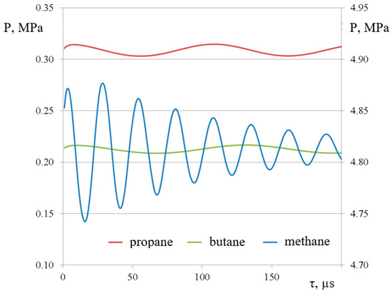 Calculation results of the pressure inside each bubble are shown in Figure 11. The comparison shows 10 times the amplitude of the oscillation of the methane bubble, and 4 times the frequency of oscillations compared to propane and isobutene alone. In such a situation, there is an intense damping of methane bubble oscillations, as the methane pressure is 15 times higher than the propane pressure and the propane pressure is 1.5 times higher than the isobutane pressure.