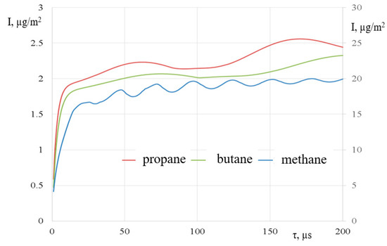 Let us compare the course of the hydration formation process for three gases: methane, propane, and isobutane. We take the diameter of all the bubbles to be equal to 1 mm. For methane, the water temperature is +5 °C and the gas temperature is 0.0 °C. The initial propane temperature in the bubble is 4.0 °C and the water temperature is +1 °C. For the isobutane bubble, the water temperature is +0.5 °C, and the gas temperature is 4.5 °C.