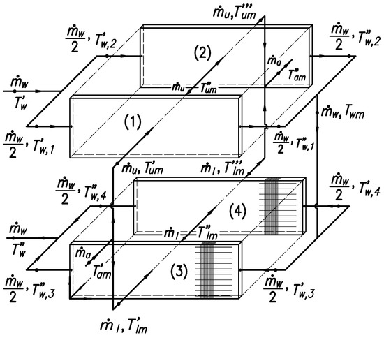 The flow rate of the water to the engine cooler is divided into two equal parts flowing through both rows of pipes in the first pass. The starting point for building a mathematical model of an engine cooler is a single-pass of the double-row PFTHE (first pass in the two-pass PFTHE with two tube rows) (Figure 2).