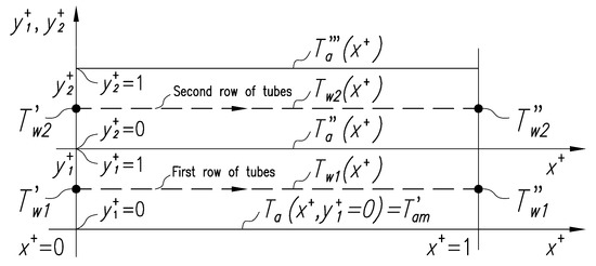 where , dimensionless coordinates , Cartesian coordinates (Figure 2) the water temperature in the tube in the first row, the temperature of the air in the first row of pipes.
