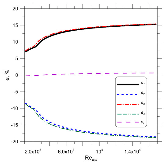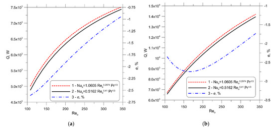 The designations mean the thermal capacity of the specific pipe row (Figure 1) with a uniform HTC throughout the car radiator given by Equation (32). The symbol stands for the thermal capacity in a particular row, with different HTCs in the first and second pipe rows. The first-row HTC was evaluated, applying Equation (30) and in the second row by using Equation (31). When the HTC on the air-side is constant across the entire radiator, then in Equations (50)–(54), is assumed, and if the HTCs in the first and second tube rows are different, then should be used. The relative differences between the thermal capacity with different HTCs and the capacity with constant HTC across the entire car radiator were also determined: