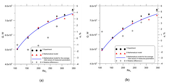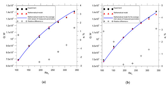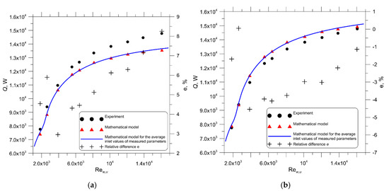The comparison of radiator output versus the water-side Reynolds number obtained experimentally and using the mathematical model of the engine cooler with the uniform air-side Nusselt number determined by (a) CFD modelling and (b) empirical correlation; : relative difference.