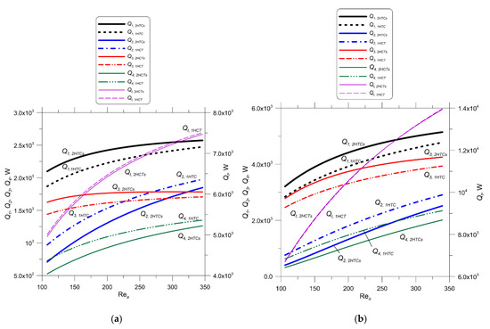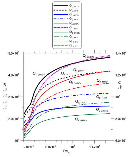 Figure 7a,b show that considerable discrepancies in the exchanged heat flow through the first and second rows of pipes for uniform and different HTCs are higher for a larger volume flow rate passing through the cooler. The differences in the thermal capacities of individual pipe rows with equal and different HTCs for both pipe rows become smaller as the Reynolds number on the air side increases.