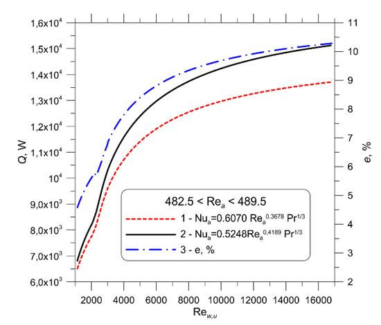 Figure 8 depicts a comparison of the thermal output of the car radiator for the CFD-based air-side correlation (35) and empirical correlation (45) for averaged measurement data: m/s, , and . The volume flow rate of water at the radiator inlet varied from 309 to 2,406 litres/h. The Reynolds number on the air side changed from 482.5 to 489.5, and the water-side Reynolds number in the first (upper) pass of the cooler varied from 1,834 to 16,084. Examination of the results reported in Figure 8 reveals that the capacity of a round-tube radiator calculated for the empirical correlation with the air-side Nusselt number exceeds the capacity of the radiator calculated using the correlation with the Nusselt number on the air side obtained by CFD modelling. The relative difference calculated using Equation (49) is about 5% for a Reynolds number on the water side of 1800 and about 10% for a Reynolds number of 16,000 (Figure 8).