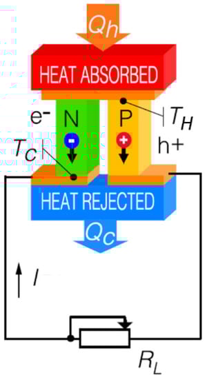where is the internal electrical resistance and is the external electrical load resistance (Figure 1). Note that Since is proportional to , the value of the temperature difference across the TEG is crucial to achieve high output power values. Producing the highest amount of energy is necessary to maintain TEGs under big temperature gradients as long as possible.