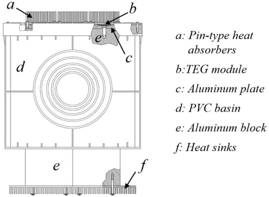 Non-previously defined material properties used in the model were extracted from the ANSYS library. The effective material properties of the TEGs were obtained from the manufacturer’s datasheet. The TEG effective thermal conductivity was estimated from = 5.33 Wm−1K−1, where is the TEG thickness, is the nominal heat flow through the TEG, is the TEG cross sectional area and is the nominal temperature difference across the TEG.