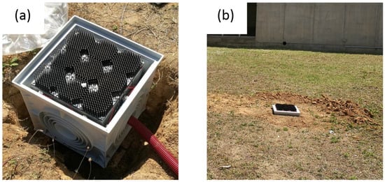 (a) View of the STEG before being buried (dimensions of the outer PVC catch basin 440 × 440 mm2 cross sectional area and 400 mm length; of the inner aluminum block 300 × 300 mm2 cross sectional area and 500 mm length; location 41°57′54″ latitude, 2°49′52″ longitude); (b) general view of the STEG location.