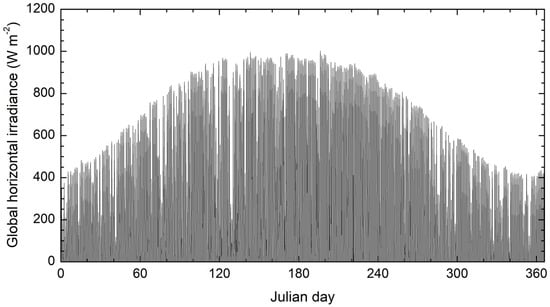 Information regarding weather conditions was available through the weather station of the university campus [] situated 175 m away from the site (the uncertainty of data was ±10 W m−2 for the global horizontal irradiance and ±0.1 °C for the air temperature). The selected location allowed a high solar radiation contribution, with about 2500 sunshine hours per year and a mean annual solar irradiance on the ground (horizontal) of 640 W m−2 (see Figure 4).