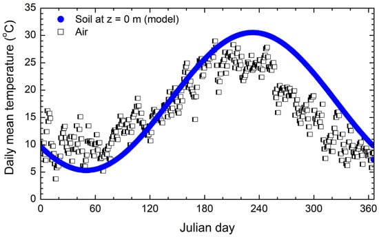 Wu and Nofziger [] analyzed the feasibility of using air temperature data to estimate the soil temperature. Weather stations are much more widespread than sites measuring ground surface temperature, so the potential use of atmospheric data is of great interest. They analyzed daily mean temperatures during a three-year period and concluded that Equation (6) with equal to the annual average of the daily mean air temperature, equal to half of the annual amplitude of the daily mean air temperature, = 365 days and as the time lag of the occurrence of the maximum daily mean air temperature slightly underpredicted the daily averaged values of surface soil temperature by 2 °C. Similar data were reported by other authors. Since the surface soil temperature was unavailable for a one-year period in our site, we applied Equation (6) with , where was the daily mean air temperature recorded by the weather station, and was half the amplitude of the annual variation of this daily mean. The time lag was determined by matching the mean soil temperature measured at m at 24 July 2017 with data obtained from Equation (6) with = 365 days and = 3.94 m. The predicted annual signal of the daily mean surface soil temperature is shown in Figure 5.