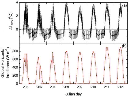 Data were recorded during almost eight days (24–31 July 2017) at variable intervals below 15 min. Temperature differences between upper and lower sides of the TEG working under open circuit conditions are shown in Figure 8a. Daily peak differences (day—night) of more than four degrees were observed in most of the days. The highest temperature difference was obtained on 27 July at 12:30 (UTC) with a value equal to = 3.6 °C. The most negative one was reached on 25 July at 20:20 (UTC) with = −1.2 °C. Note the high variability of diurnal values during the first three days of measurements, even reaching negative values during daylight hours. This was caused by local weather conditions, since days 205 to 207 (24–26 July) were cloudy with high variability of horizontal global irradiance (see hourly data in Figure 8b) including very weak precipitation. The sky was clear from day 208 on. Thus, data from Figure 8a,b clearly revealed the strong dependence of our STEG on solar irradiance behavior with an almost immediate response of to its variations.