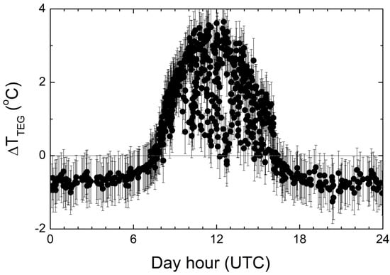 Hourly values for all the eight days recorded in Figure 8 are shown in Figure 9. As noted above, the output of the STEG was highly variable during daylight hours because of the weather conditions. By contrast, this was not observed during night, even on cloudy days in which radiative cooling was expected to not be so intense. Thus, although peak performance was always reached at noon, steady conditions at night were very favorable for a constant generation. The mean of values from 0:00 to 7:00 and from 17:00 to 24:00 was −0.66 °C with minimum and maximum values equal to −1.25 °C and −0.25 °C for these 14 h intervals. In the 8 h interval ranging from 8:00 to 16:00, the mean value of was 1.74 °C, with a maximum of 3.65 °C and a minimum of −0.23 °C.