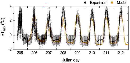 We point out that predicted data did not exactly reproduce the experimental values. The main discrepancies were found near noon (i.e., peak values of temperature differences) and during the nighttime. One of the reasons for underpredicting peak daytime values may come from the use of boundary conditions that were hourly averaged values. Weather station data were not recorded at short intervals, and only mean hourly values were available. This was the reason that the model tended to underestimate the peak of reached at daylight times, as can also be clearly seen in Figure 10. Differences between maximum observed and predicted were on the order of 0.3 °C. In addition, this may be the reason why the model did not capture the rapid variations of well, as was observed during the first three days in Figure 10. On the other hand, absolute values of during the night were slightly overpredicted by the same amount (0.2–0.3 °C) for days 208 to 211. This was probably caused by the thermal inertia of the device that increased the cool down of the upper surface in case of diurnal temperatures not as high as those observed. Note that night data were very well reproduced for days 205 to 206 in which mean diurnal values were closer to hourly mean observations. All in all, the model results were promising with a reasonable reproduction of observed data.