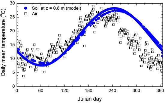 The time lag between the maximum daily mean air temperature and the maximum daily mean surface temperature was about 17 days, being similar to the 13 days lag observed in []. Note that the daily variation of the surface temperature was ignored. However, at m, which was the depth of the boundary condition applied to the numerical model, the amplitude of this signal is very weak (see, for example, []), so the conclusions would be essentially the same when including it.