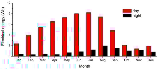 Global (day plus night) monthly values varied from 9.5 Wh (=34.2 kJ; July) to 2.6 Wh (=9.4 kJ; November) with an annual energy generation of 70.9 Wh (=255.1 kJ) and mean daily energy of 0.2 Wh (=697 J d−1). The contribution of the two working modes (day and night) to the total monthly energy generation is shown in Figure 13. Nighttime was a very important mode during autumn, contributing more than 44% to the total energy harvesting in November. However, its contribution was below 6% in April.