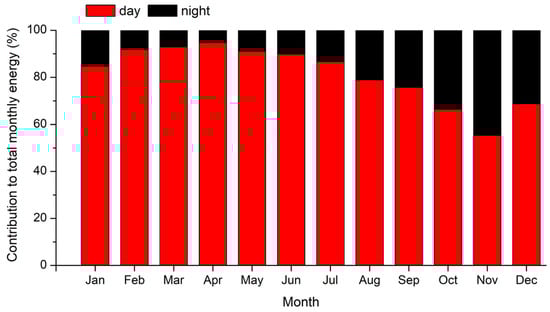 Contribution of the two working modes (daytime and nighttime) to the total monthly energy harvested. Data available in the Supplementary Materials.
