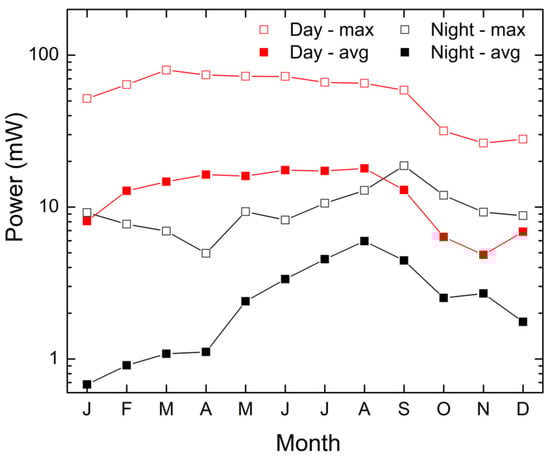 Monthly maximum and mean values of output power obtained during day and night periods. Data available in the Supplementary Materials.