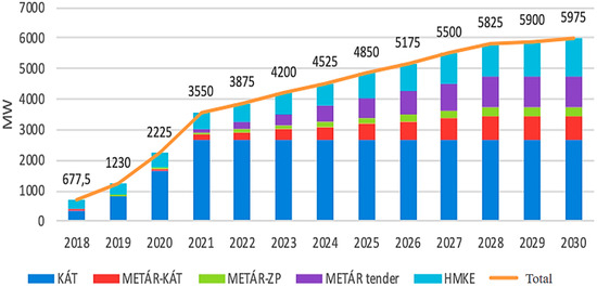 Expected photovoltaic (PV) power in Hungary [51] * (* Hungarian abbreviations of Hungarian PV power plant sizes and support schemes: KÁT—Hungarian system of supporting green energy from renewable energy sources, METÁR—Renewable Energy Support Scheme, ZP—Green Premium, HMKE—household-size small PV power).