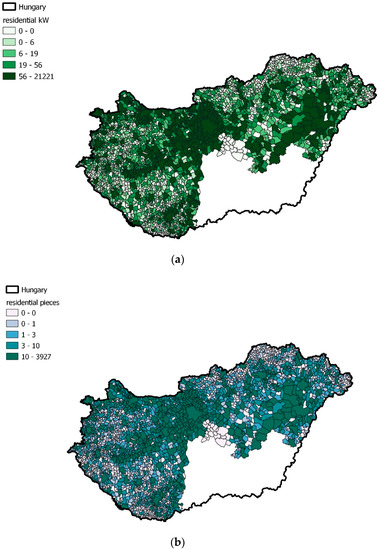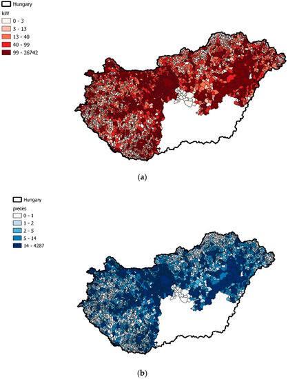Total residential HMKE power (a) and the number (b) of residential HMKEs in the settlements of Hungary.