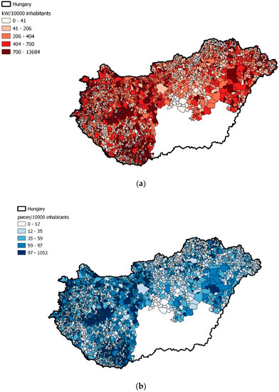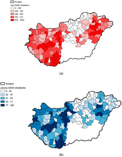 Total HMKE power (a) and the number (b) of HMKEs per 10,000 inhabitants in the settlements of Hungary.