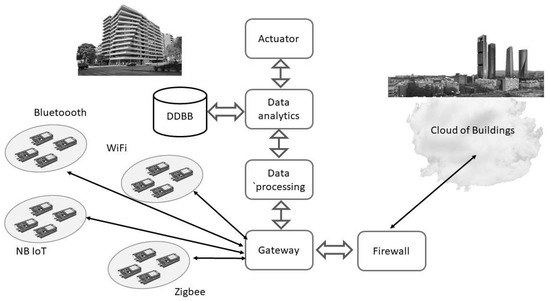 Smart buildings are composed of a set of communication technologies, sensors, actuators and computing devices, aimed at enabling different devices to communicate, share and exchange information, interact with the others, including external ones, and being managed, programmed, disabled, controlled and automated remotely [7]. The total building energy consumption, including any energized system or device, has a remarkable impact on the environment at the world scale because of the CO2 emissions to the atmosphere during the production process. Currently, there is a noticeable scientific activity in this field, and new technologies and techniques are being used to reduce the environmental impact by using the so-called green energies (suppliers of electrical energy generated by green sources: solar panels, wind generators, etc.) as well as energy harvesting, i.e., systems installed in the building to get energy independently of distribution-supplier companies. The systematic design and construction of smart buildings is needed to achieve the environmental compromises and sustainability objectives. Additionally, big data techniques are being used for several applications ranging in business, health, defense, communications, control prediction, forecast, etc., and are also applied in buildings to enhance the efficient use of resources.