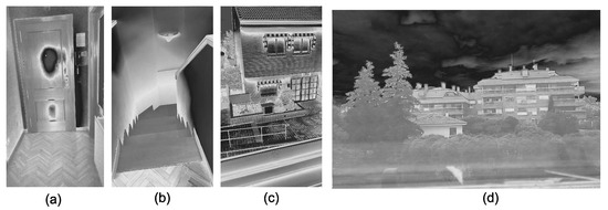 Another important source of information during fieldwork is the identification of construction elements of the building that could be the responsible for the energy efficiency drop by using thermal imaging cameras. These cameras can be used to perform internal/external inspection of the building, and its surroundings to identify elements which could impact the energy efficiency, and the internal construction elements, as those which allow acceding the building, e.g., main entrance door, garden door, garage access door. Figure 3 shows thermographic images of a residential area single-family building, similar to that shown in Figure 2, representing the main entrance door (a), the stairs connecting the ground level tp the first one (b), the main entrance wall (c) and the surrounding area (d). Considering Figure 3a, corresponding to the internal part of the door to access the house, a significant temperature difference impairment is remarked, revealing air flow which contributes to decreasing the energy efficiency. In the figure, it is observed how the slit with the door closed shows a remarkable different color/tone due to the temperature difference because of the air flow. Additionally, based on thermographic pictures, the performance of windows/doors (hermetic featuring), surrounding area (other buildings, roads, vegetation), roof, etc. can be observed and analyzed to improve the accuracy of the building thermal model.