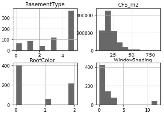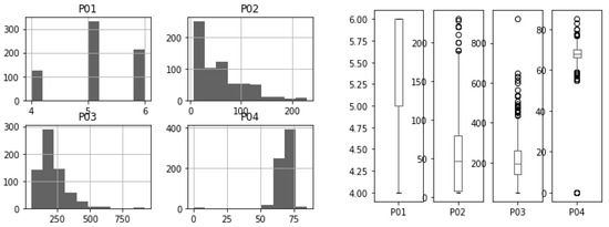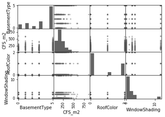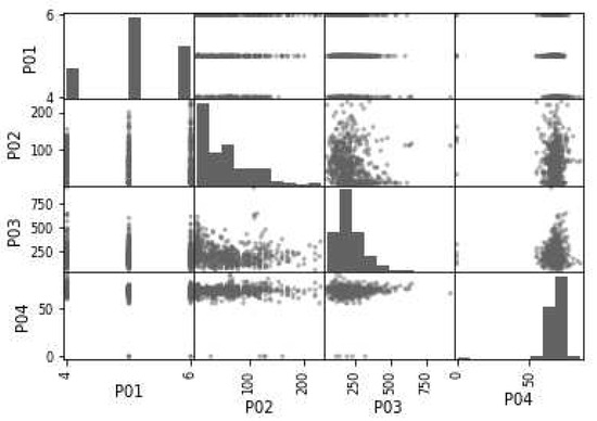 Figure 7 and Figure 8 represent the histograms and scatterplot of the parameters considered in the second approach. One of the parameters shows very little dispersion which will be detrimental to have a reliable classification (P01). Figure 8 shows the interrelation between the parameters that have been used in this second approach using two scatterplots. Parameters P03 and P04 are closely related and correspond to the building surface and energy consumption. These parameters are directly related to the energy efficiency of the building,