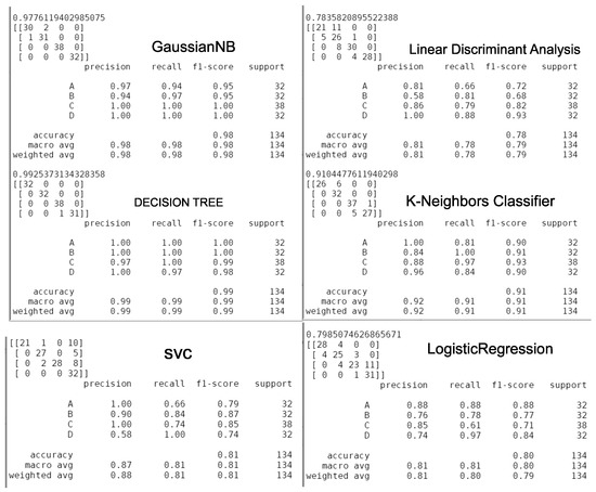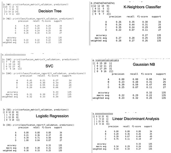 Figure 12 shows the ratings obtained by the six classifiers considered in the analysis of buildings’ energy efficiency categorization. We can see that the results obtained are notably better than in the previous cases. The algorithms that achieve the worst scores are the Logistic Regression, the SVC support vector computer and Linear Discriminant Analysis. Better results are shown by the k-Neighbors classifier. Then comes the Gaussian classifier, and the decision tree classifier is the one obtaining the highest scores. We can therefore conclude that the machine learning techniques applied to energy classification of buildings seems to be very useful given the degree of reliability showed by the algorithms that have been used. However, it is necessary to highlight the previous work required in the data collection task and, above all, in the processing of the data in order to identify which are the most relevant to face the classification problem. Using many parameters and a larger amount of data does not guarantee a higher reliability.