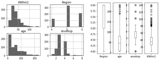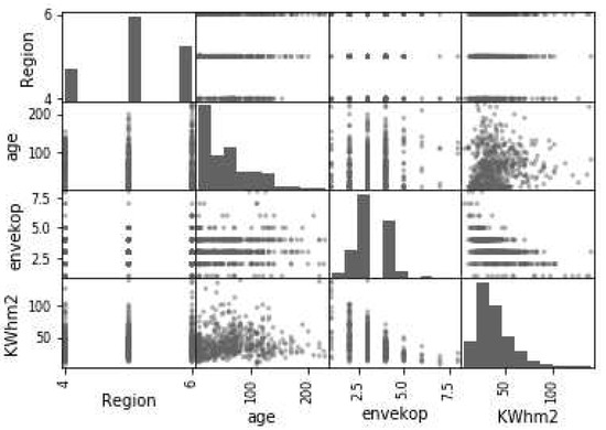 Figure 8 shows the interrelation between the parameters that have been used in this second approach using two scatterplots. It can be seen whether the parameters are strongly related. We identify those corresponding to energy consumption in (KWh) and the surface area n squared meters () of benefit, so this relationship seems logical.
