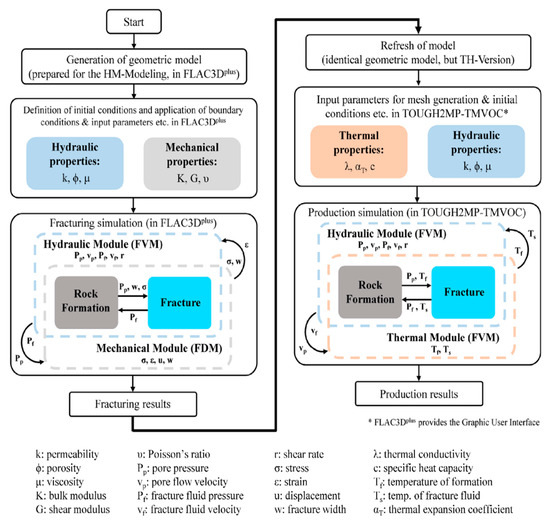 In combination of hydro-mechanical processes, thermal processes also take place. By combining the heat flow equation (Equation (4)), continuity equation (Equation (5)), and thermal constitutive equation of the materials (Equation (6)), the thermal conduction process can be described, while Equation (7) shows the heat convection process [37].