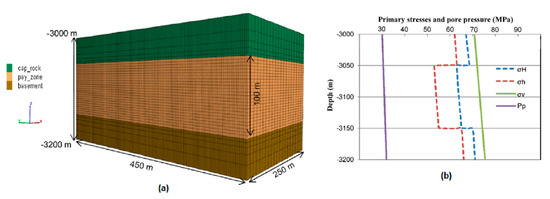 (a) Schematic of fictive ½ 3D reservoir model with corresponding (b) initialized primary stresses and pore pressure.