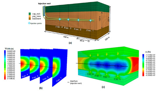 Illustration of the four created fracture results with (a) the ½ 3D model having four fracture planes of 80 m fracture spacing, (b) fracture widths, (c) and minimum horizontal stress shadow.