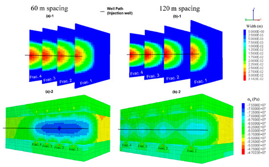 Comparison of fracturing results based on fracture width and stress shadow with fracture spacing of (a) 60 m and (b) 120 m.