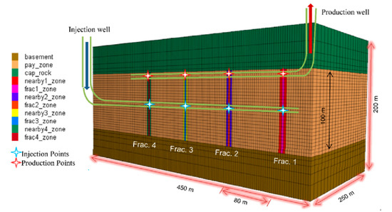 After fracturing operations, production modeling is analyzed further. While, considering the generated fractures as porous and permeable medium, four fracture zones are generated using an equivalent fracture concept based on fracturing results with FLAC3DPlus and then the model is imported to TOUGH2MP-TMVOC for hydro-thermal simulation (as explained in Figure 1). This approach provides benefits of accounting for coupled thermo-hydro-mechanical effects in a time efficient manner. Moreover, TOUGH2MP-TMVOC provides the ability of multiphase multi-component fluid flow through fractures and reservoir formations, facilitating the temperature and pressure dependent enthalpy, as well [39].