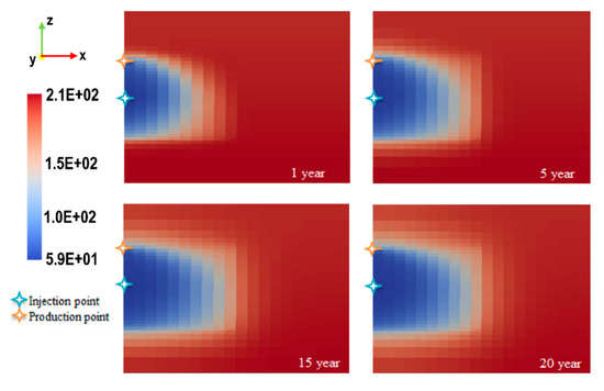 Temporal evolution of temperature decline in 1st fracture plane after 1, 5, 15, and 20 years of production.