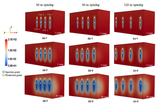 A comparison of the spatial evolution of temperature decline in the developed model having different fracture spacing is shown in Figure 7. It is observed that, with the passage of time, more area especially in the y-direction depletes significantly and contributes to heat conduction during fluid flow through fractures. Furthermore, with the increase in fracture spacing, a larger area is influenced by cold water injection and hence more stimulated volume in terms of heat conduction is achieved.