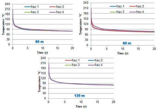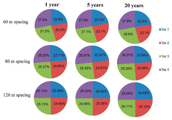 The corresponding comparison of net-energy contribution (%) for each fracture after 1, 5, and 20 years of production with variable spacing is illustrated in Figure 9. It can be seen that, with 60 m spacing, fracture 1 is contributing least, while fracture 4 is contributing maximum in terms of energy production. This trend remains the same throughout the 20 years of life span. In the case with 80 m fracture spacing, the contribution rate somewhat becomes homogenous as compared to the 60 m spacing case. However, fractures 1 and 2 are still contributing less compared to fractures 3 and 4. An analogous heat contribution is observed with 120 m spacing, which identifies enough spacing for homogeneous heat production through each fracture. It is observed that the unevenness of energy contribution through each fracture is amplified due to shorter distance among fractures in the case of 60 m spacing.