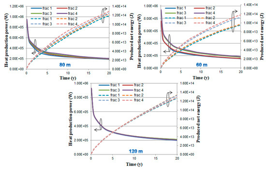 Comparative results of produced net heat and heat production power within 20 years with 60, 80, and 120 m fracture spacing.