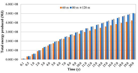 Schematic of cumulative energy produced during 20 years through combined four half fracture model with 60, 80, and 120 m fracture spacing.