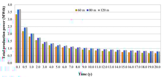 Schematic of heat production power during 20 years through the combined four half fracture model with 60, 80, and 120 m fracture spacing.
