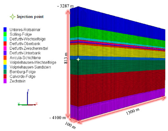 The true representation of the reservoir model was depicted by the actual prevailing geological and strati-graphical conditions. Considering symmetrical geological state, a ¼ 3D model was generated which lies at depth between −3287 and −4100 m and discretized into 36,520 rectangular blocks having dimensions of 1300 (x) × 100 (y) × 813 m (z), respectively (Figure 13). The injection point is located at a depth of −3660 m in volpriehausen-sandstone formation, while temperature of the model varies according to the geothermal gradient of 0.03 °C/m. The mechanical and hydraulic properties of rocks and stresses were adjusted based on the previous work of Hou et al. [43] and Zhou et al. [44] with the initial pore pressure of about 65 MPa.
