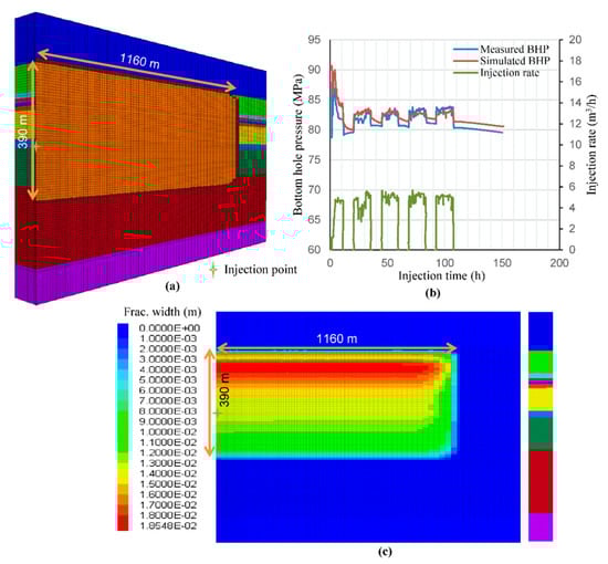 The study results of Tischer et al. [41] were used for our simulated model verification. A total volume of 20,000 m3 of pure water was injected with a maximum injection rate of 5.4 m3/min. Fracturing operation continued for around 110 h of injection. At the end of the injection, a large fracture having half-length of about 1160 m was created (Figure 14a). The comparison of the simulated bottom hole pressure (BHP) and measured BHP is shown in Figure 14b, after the conversion of surface treating pressure to bottom hole pressure, encompassing hydrostatic pressure and frictional losses. The simulated results match well with the measured one, which proves the suitability and acceptability of used parameters and stresses to model fracturing operation. Figure 14c shows the half fracture geometry at the end of the injection period. The maximum width of 1.85 cm is obtained along the formation having the least value of minimum horizontal stress which also corresponds towards verification of the generated model.