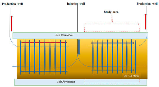After the validation of our geometric/numerical model, an innovative idea is presented to analyze the large geothermal area by creating 10–12 hydraulic fractures to both sides of the well based on the schematic fracture pattern (Figure 15), having a combination of multistage hydraulic fracturing with three vertical wells and lesser injection fluid volumes. This approach can not only provide extra advantages of exploiting a larger geothermal area with lesser seismic activity due to lesser injection volumes, but also reduces the drilling investment cost in comparison with energy production. The accuracy and time consumption for the numerical modeling of multiple fracturing operation is highly dependent on the geometry and number of elements of the simulated model. After conducting numerous simulations, three massive fracture modeling was adopted because of multiple-fracture geometry constraints.