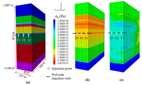 3D ½ model showing injection points of fractures 1, 2, and 3 with (a) 60 m fracture spacing, (b) prevailing minimum horizontal stress before fracturing, and (c) minimum horizontal stress after fracturing.