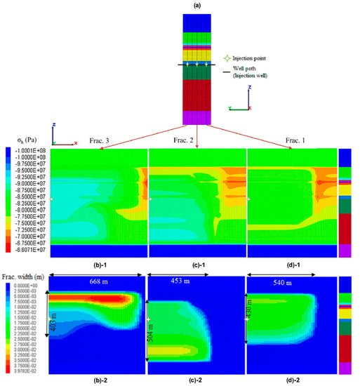 The minimum horizontal stress at the cross section along the x-z plane of each generated fracture provides valuable information related to individual fracture geometry as shown in Figure 17((b)-1,(c)-1,(d)-1). The highest increase in horizontal stress is observed in fracture 3, which is created at the end. The variations in fracture width and shape can be more prominent in massive fracturing operations as higher fluid volumes are used to create large fractures. This can be verified by analyzing the obtained results of fracture geometry with 60 m spacing as illustrated in Figure 17((b)-2,(c)-2,(d)-2). Fracture 1 shows a normal shape having the highest fracture width at the upper section of the formation against the least minimum horizontal stress. The shape, width, and area of 2nd and 3rd consecutive fractures are significantly dependent on the stress re-orientation of 1st and 2nd fractures, respectively. Higher fracture width at the upper side of 1st fracture restricts the propagation of the 2nd fracture at the upper side and forces the propagation of the 2nd fracture at the lower portion. Therefore, maximum fracture width of the 2nd fracture exists at the lower side.