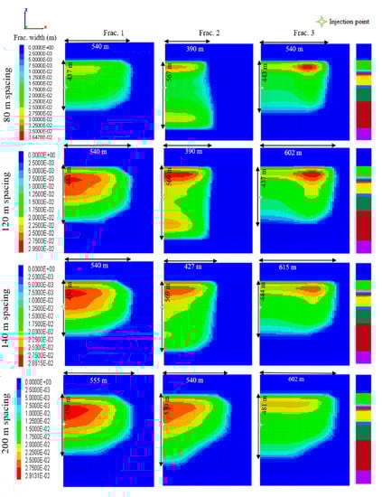 To comprehend the stress shadow influence with reference to fracture spacing in this particular area, fracturing simulations were performed further with 80, 120, 140, and 200 m fracture spacing, successively. The corresponding results of three fracture widths along with configurations are shown in Figure 19.