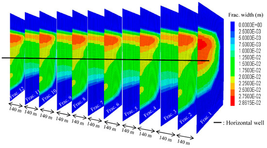 The results of 80 m spacing are somewhat similar to 60 m spacing (base case), but with a smooth increase in the 3rd fracture height. Moreover, a maximum width of the 3rd fracture reduces and occurs at the small middle portion of the fracture. This will allow the fracture to propagate in the lower formations as well. As the fracture spacing increases from 80 to 200 m, the homogeneity in the 2nd and 3rd fractures increases. The comparison also shows that the propagation of the 3rd fracture is highly dependent on the configuration of the 2nd fracture. The geometry of the 3rd fracture is somewhat inverse to the 2nd fracture. Therefore, it can be concluded that the continuation of the 2nd and 3rd fracture pattern will occur alternately in the case of a larger number of fracturing operations. Although, with more fracture spacing, chances of similar fracturing patterns increase. However, increased fracture spacing requires a longer horizontal section which can cause an extra burden in drilling, completion, and well operations cost [45]. Considering 140 m spacing as a suitable fracture pattern, the projected 12 fractures pattern is shown in Figure 20.