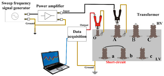 According to the measurement principle of the SFI method, it can be known that SFI measurements should be conducted on the HV winding with the LV winding shorted. For this transformer, because voltages of the HV and MV windings are both larger than that of the LV winding and voltage of HV winding is also larger than that of the MV winding, so there will be three different SFI measurement modes for this experimental transformer, i.e., “HV to MV”, “MV to LV”, and “HV to LV”. It is “HV to MV” mode when the HV winding is measured with MV winding shorted. To clearly explain the “HV-MV”, “MV-LV”, and “HV-LV” measurement connections, the schematic diagram of “HV to LV”, “MV to LV”, and “HV-LV” modes is presented in Figure 6.