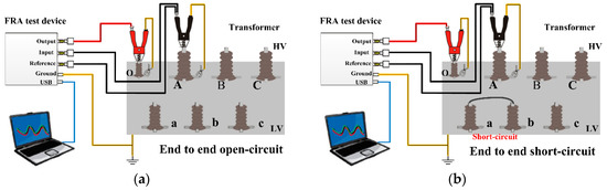 The frequency response analysis (FRA) measurement system with two different connections. (a) End to end open-circuit connection. (b) End to end short-circuit connection.