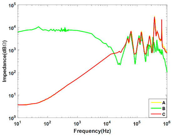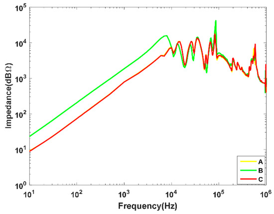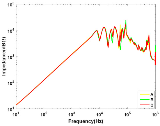 As SFI measurements have not been conducted on this transformer before, there is no original SFI reference data. Therefore, the comparison of the SFI test results can be made between the phases due to the symmetry. This comparison way is called construction-based method and it is suggested by [18]. The SFI curves of three phases of the transformer winding under the three modes are shown in Figure 7, Figure 8 and Figure 9, respectively. At the same time, to accurately analyze the variations of the SFI curves, the numerical index RF used in FRA field is applied. The calculated values of RF for the phases under three modes are, respectively, shown in Table 2, Table 3 and Table 4. The detailed calculation equations of the RF and relationship between deformation degree and the corresponding values of RF are given in Appendix A.